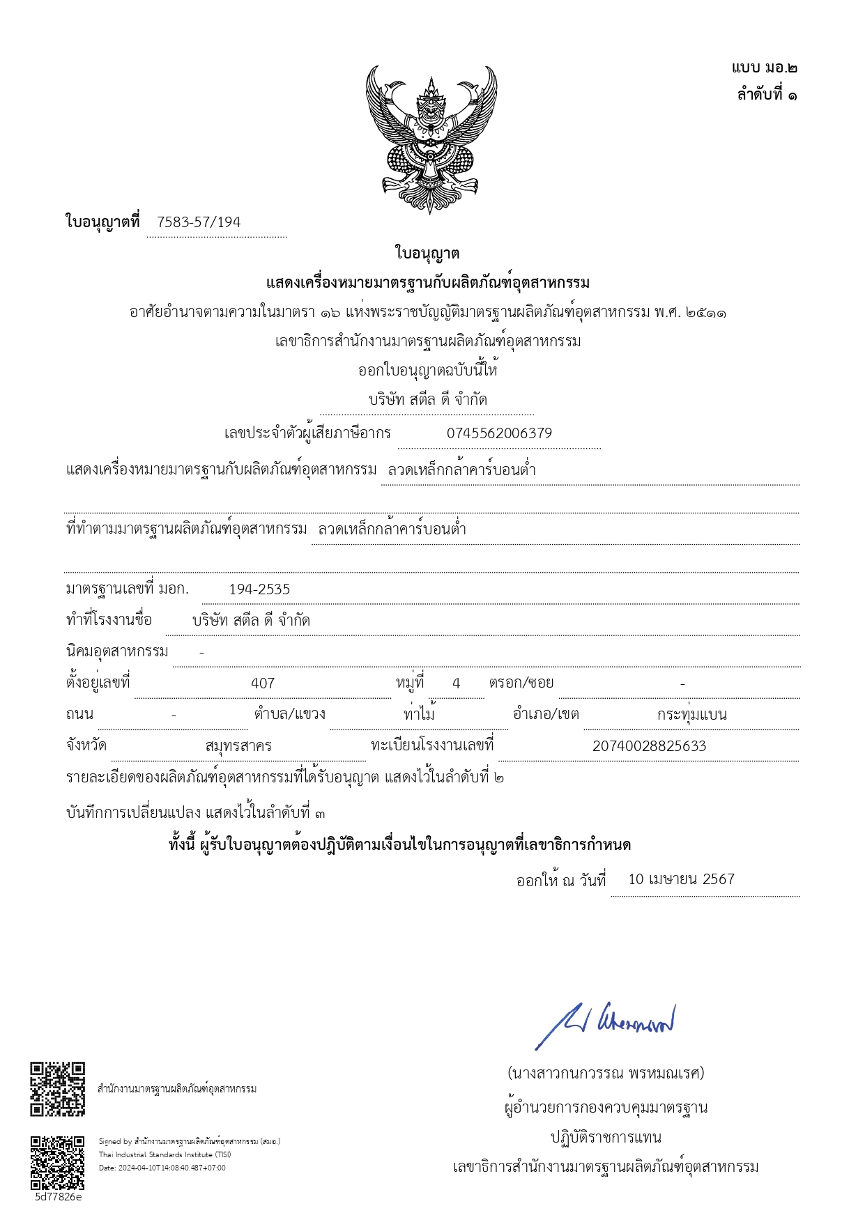 เอกสารรับรองมาตรฐานผลิตภัณฑ์ อุตสาหกรรม มอก